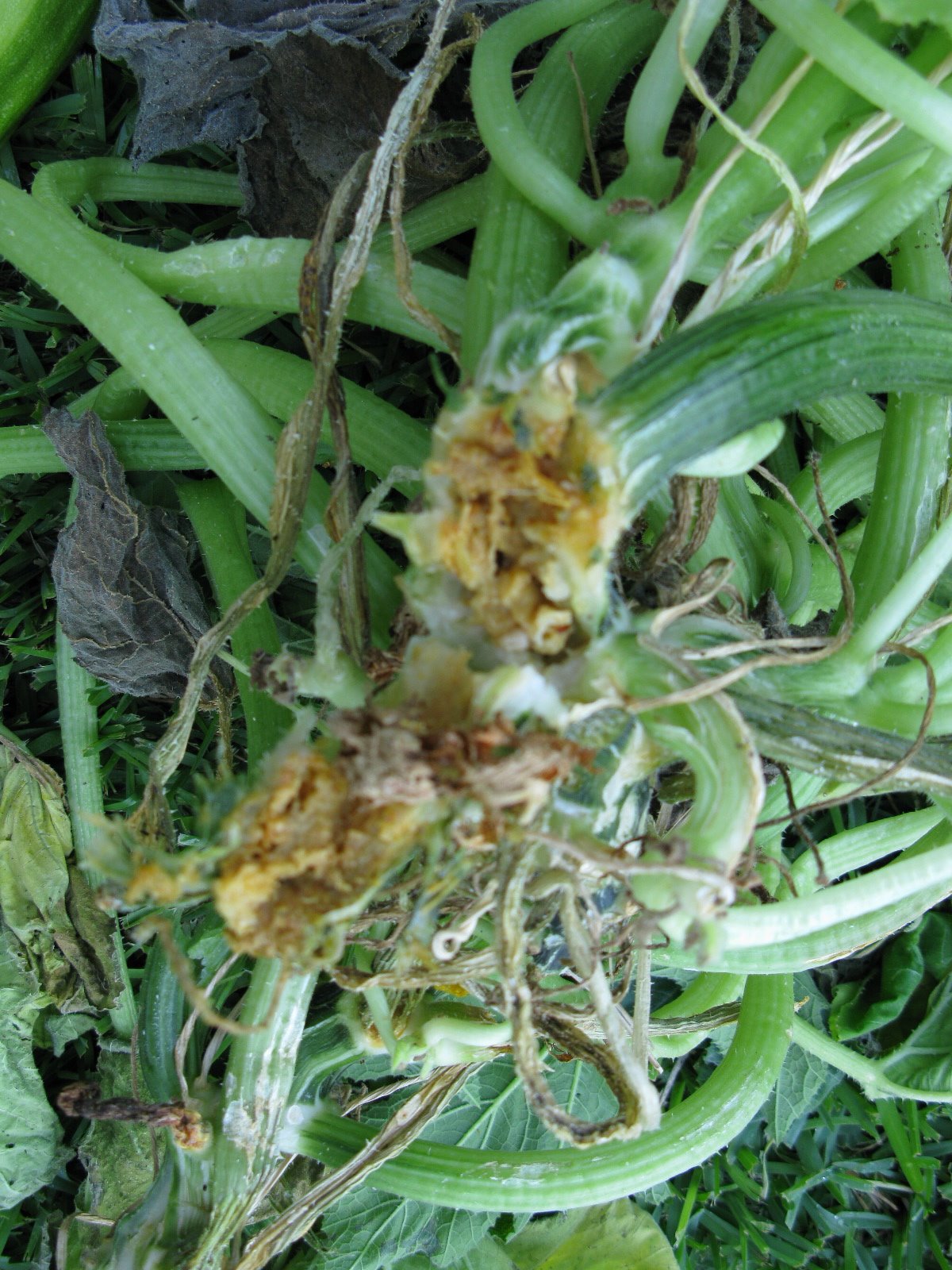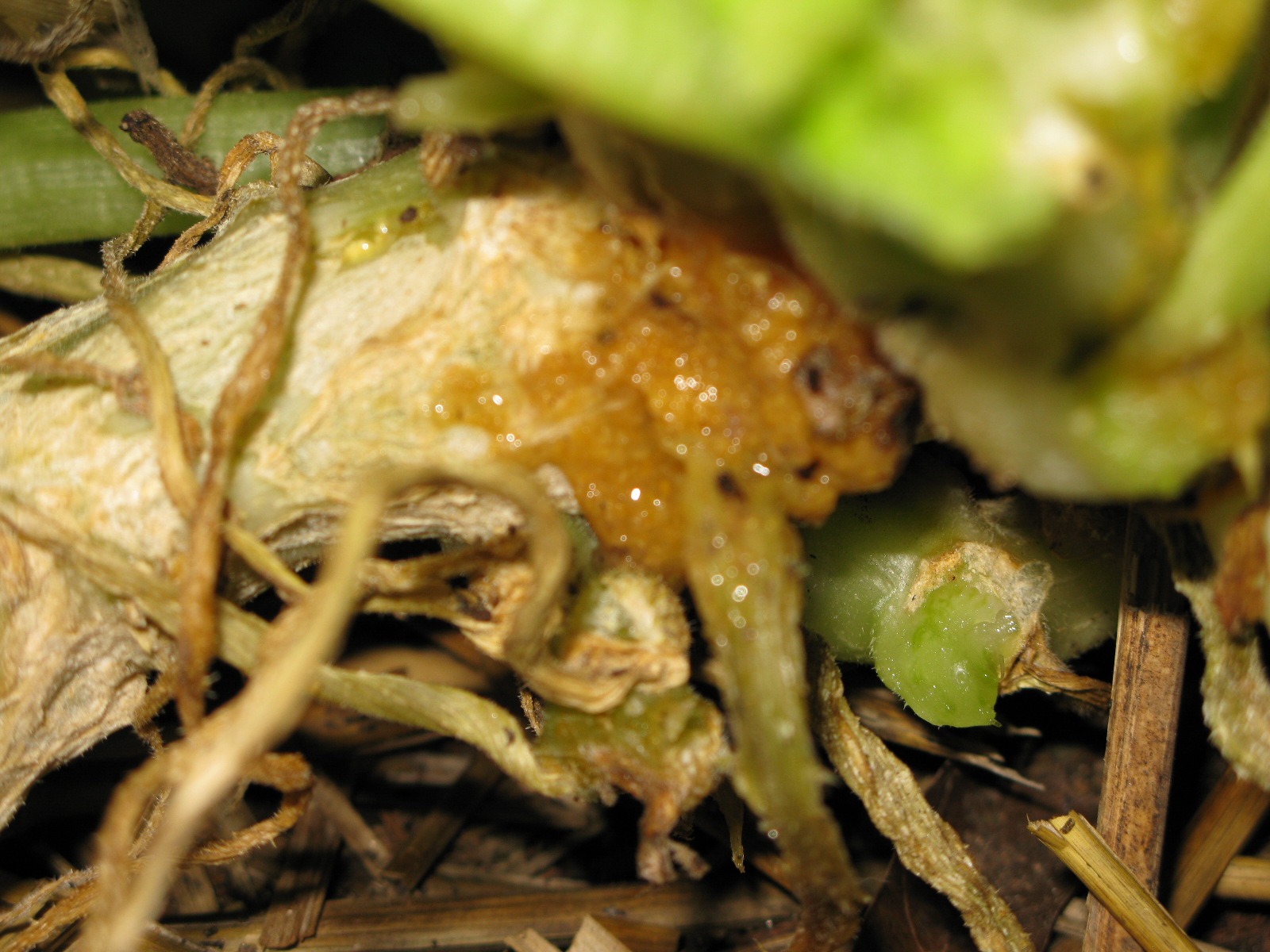 An early catch. Here’s what to look for. The yellowish substance is called frass. You can’t always see it, since it is often underneath the plant, but you’ll always be able to feel the gooey glob where the SVB entered the plant. The plant feels dry aside from this.