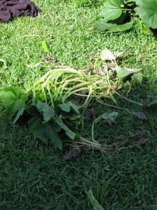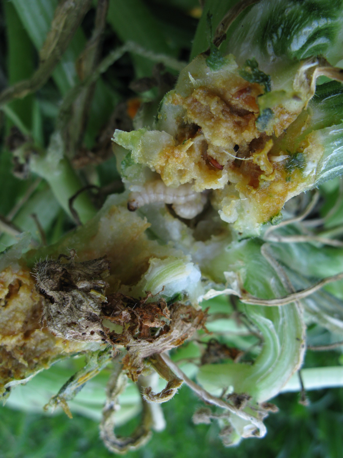 I’ve been enjoying my squash bounty knowing that it would eventually come to an end. The squash vine borers took out my pumpkin plants last year and I was waiting for their arrival this year. This morning I did my walk through before work and found one plant looking extremely pathetic. All of the leaves were drooping. Once I thought about it I realized that the leaves were a little droopy yesterday but I didn’t think anything of it. I should have known. Well anyway … it was too late for that plant. I ripped it out and started inspecting the others. Turns out I had a serious infestation on my hands. I found these terrible little creatures in all but one of my plants. I spent two hours digging them out. I lost two plants this morning and it looks like another three won’t make it. We’ll just have to wait and see about the rest. I hope I got all of them, but I’m not sure. By then end of my major surgery I was getting pretty good at determining exactly where the SVBs were, which hopefully did less damage to the plants.
