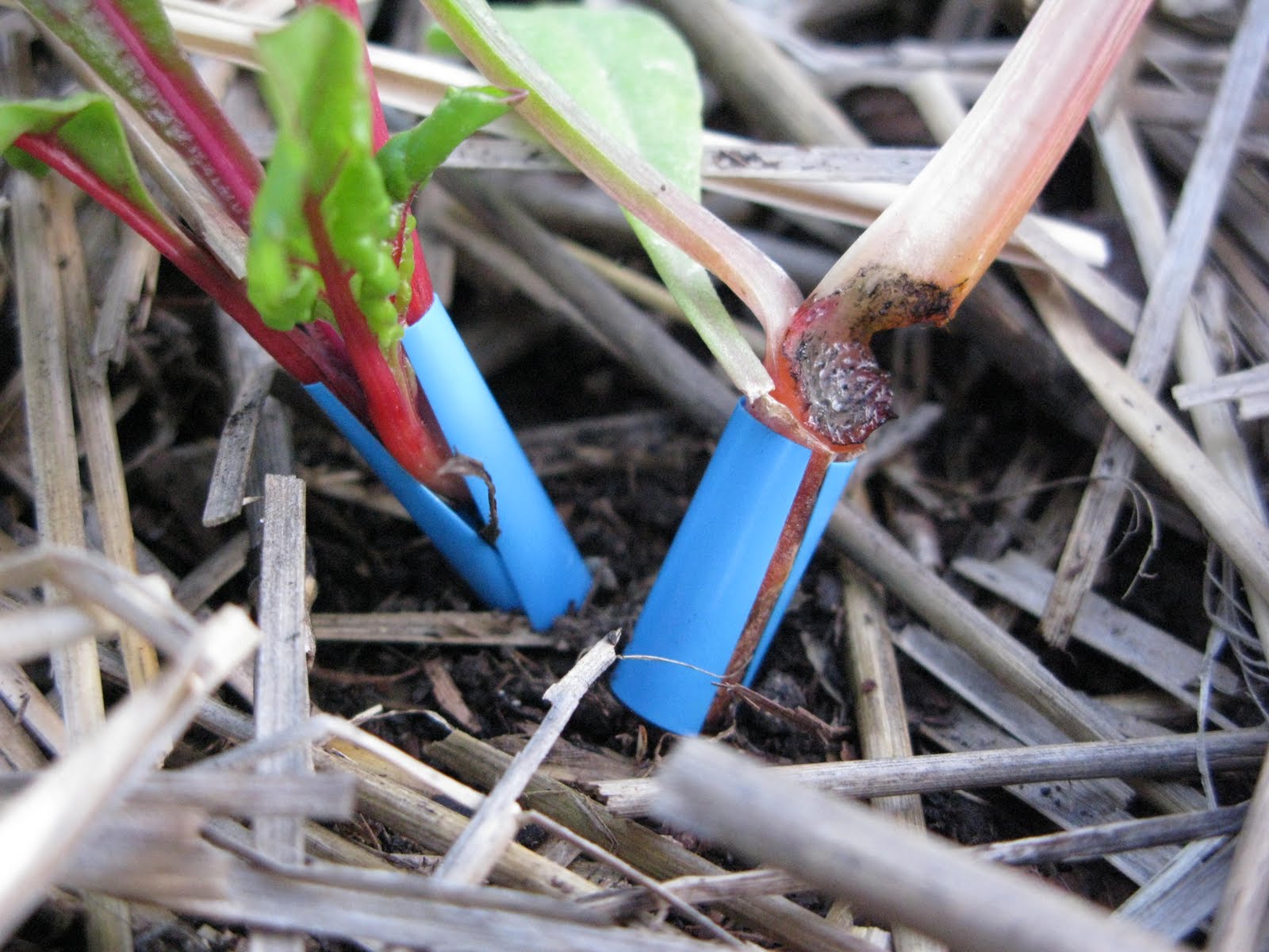 Here is where the cutworm laughed at my attempts to block him. I caught him in the act, stretching as far as possible to bite just above the straws I put in yesterday. I found a second one, but destroyed them both before taking pictures.
