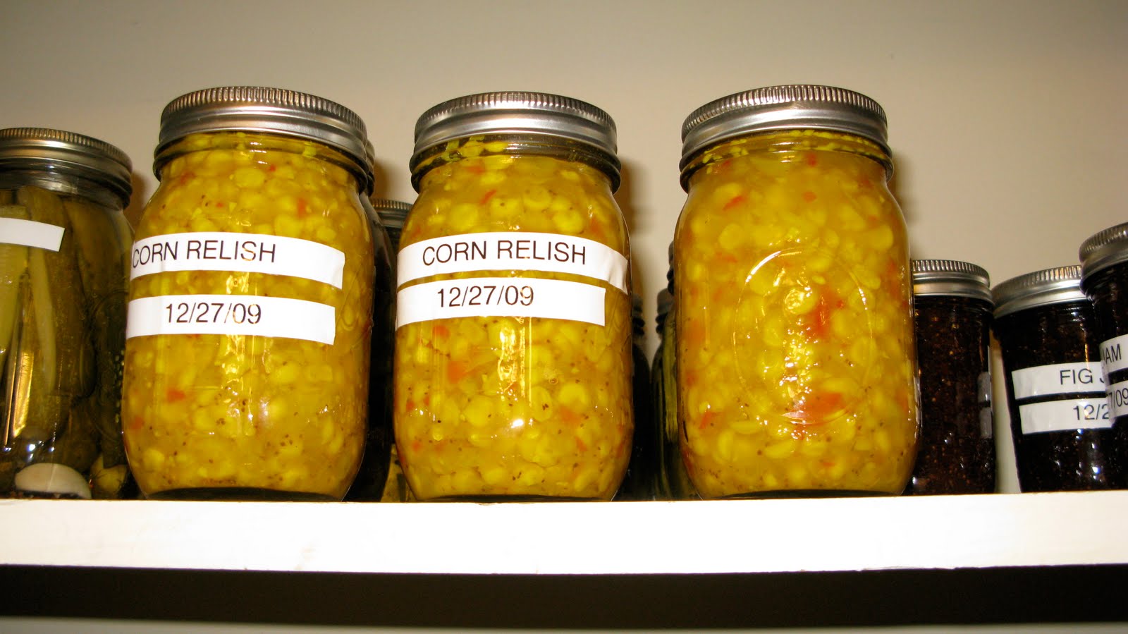 This corn relish recipe is from the official Ball canning cookbook. It uses frozen corn, which is always in season, and cabbage straight from the garden. It has a great vinegar bite to it, with a nice sweetness as well. Next time I may add a little heat.