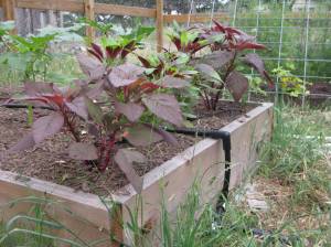 Amaranth. I have this on two different sides of the same bed. The one with more sun is significantly bigger. Last year I tried seeding outside and they never came up. This year I started indoors and the amaranth is thriving.