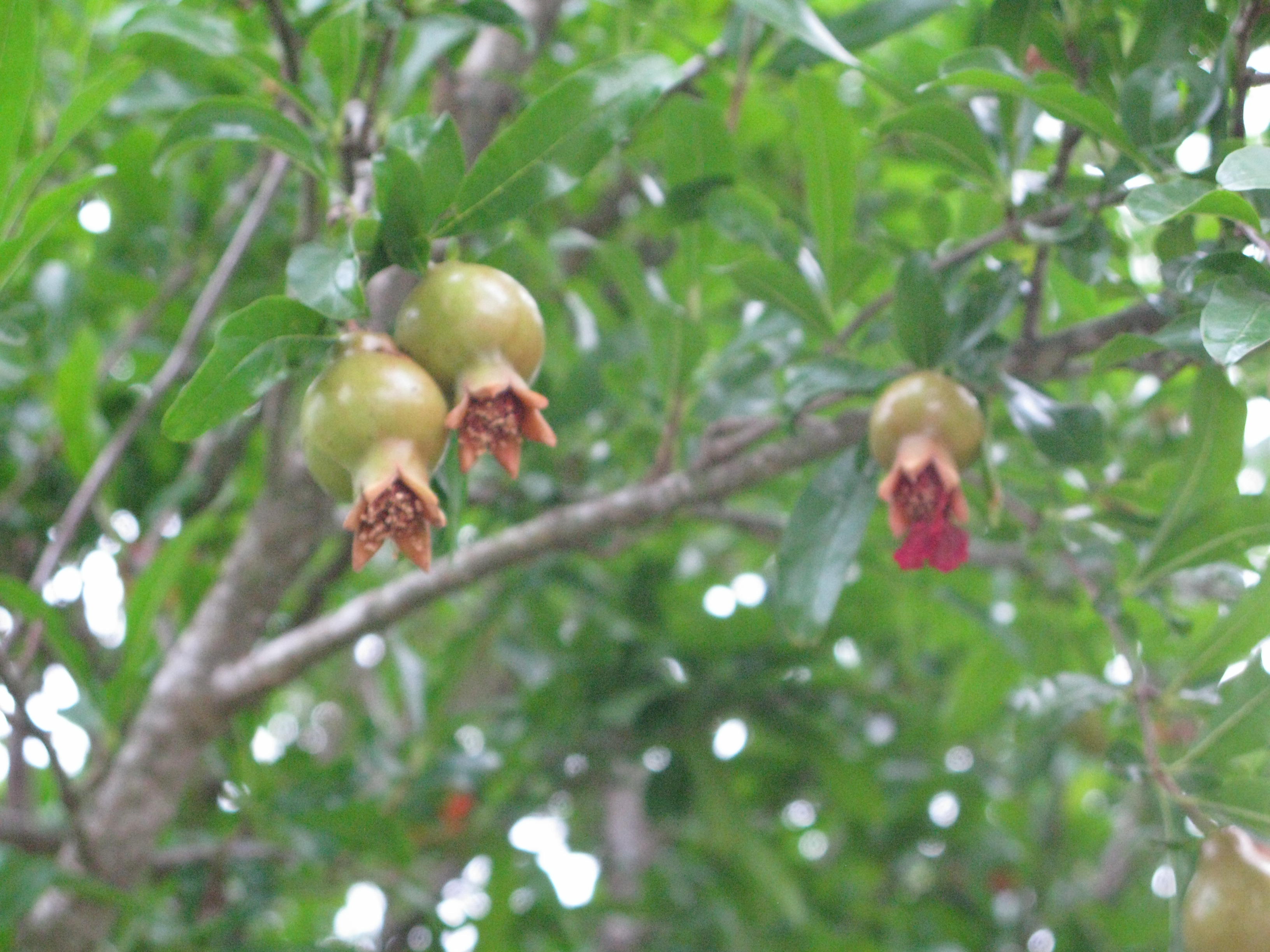 Pomegranate. Last year at this time all of them had been stolen off the trees by some critter. I'm crossing my fingers that we get to keep a few this year.