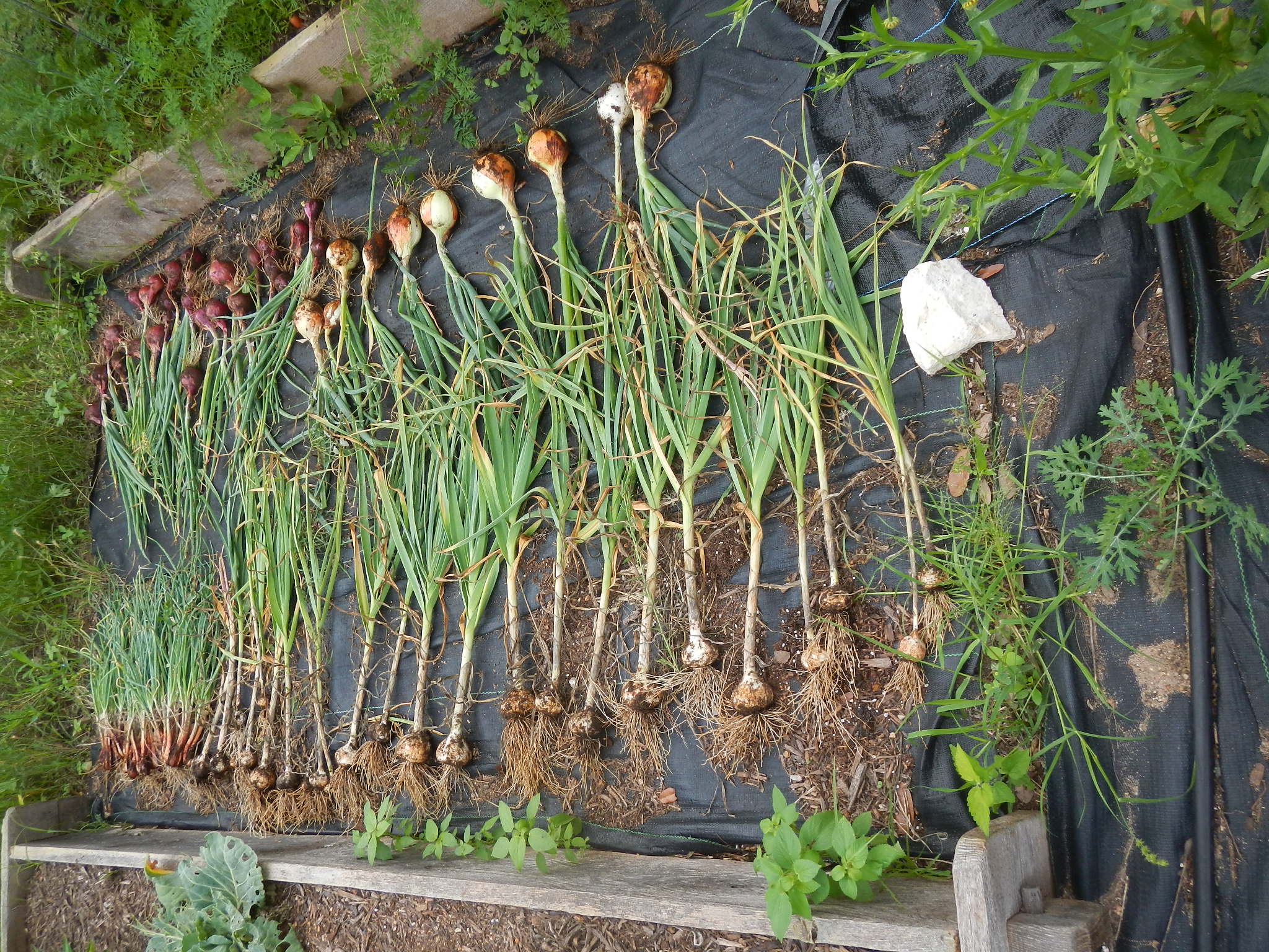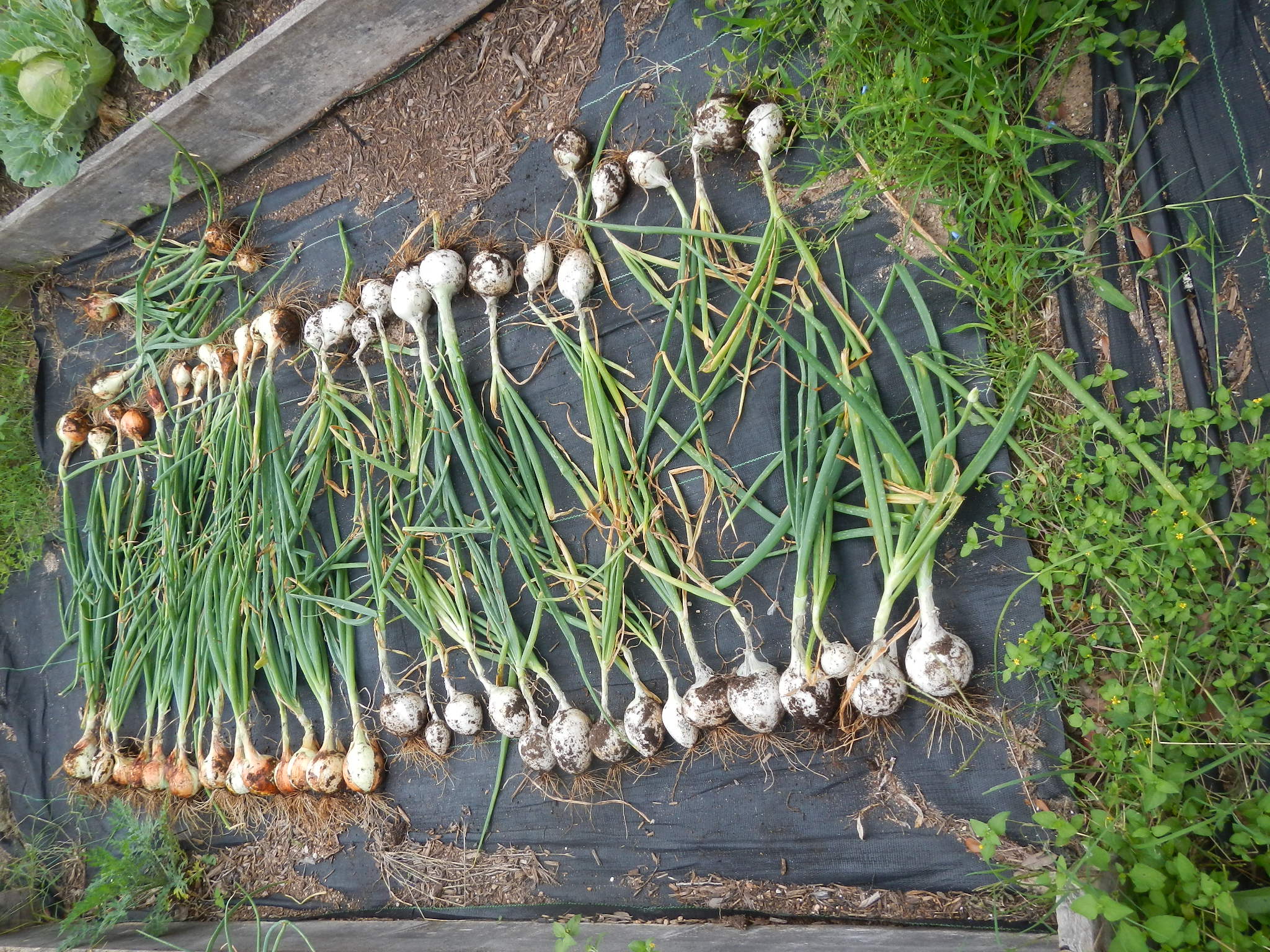 Pull the onions and garlic from the beds and lay them out in the sun for 1 day. I made sure to wait until today to give time for the soil to dry out a bit from our rain last weekend.