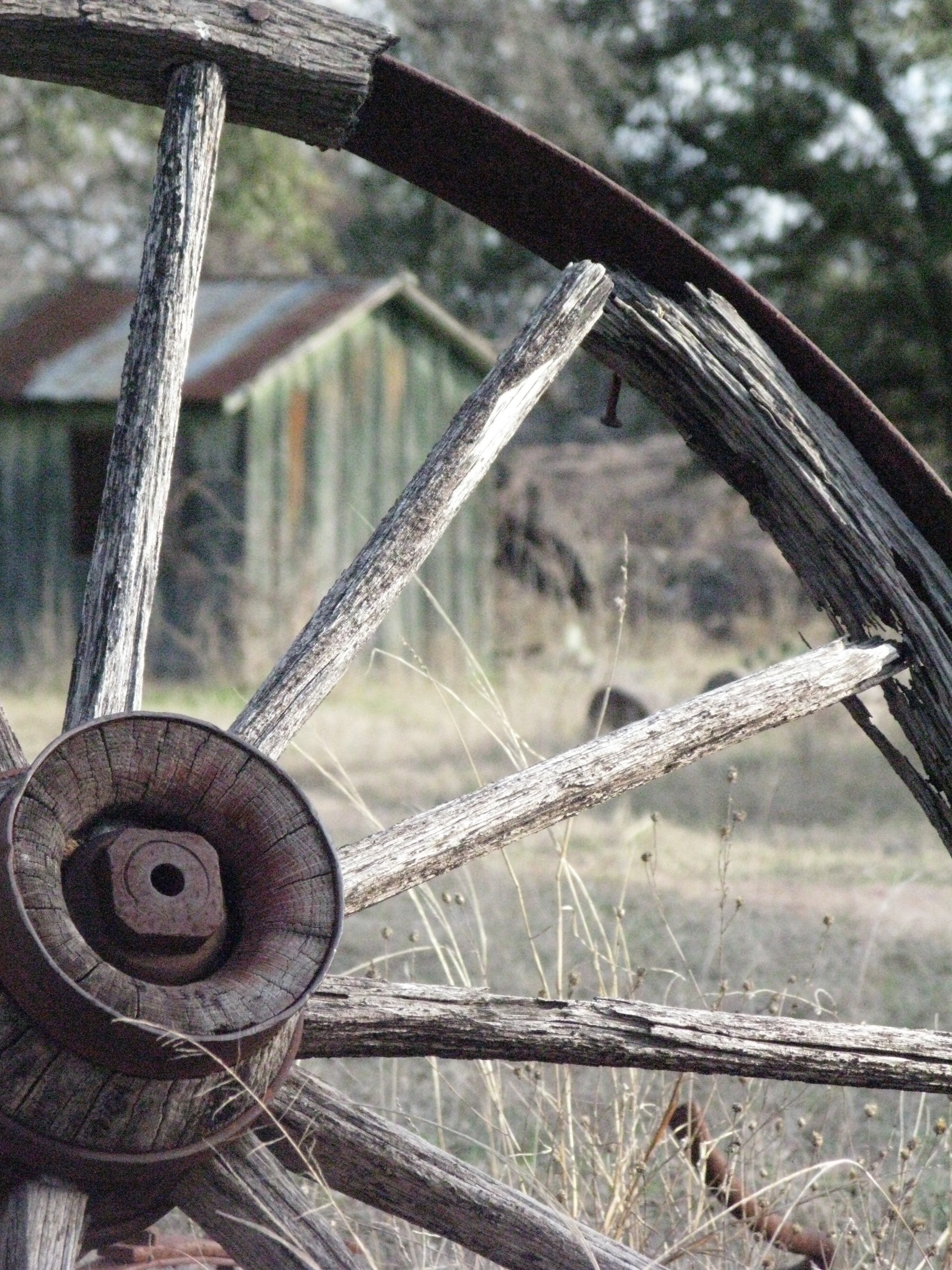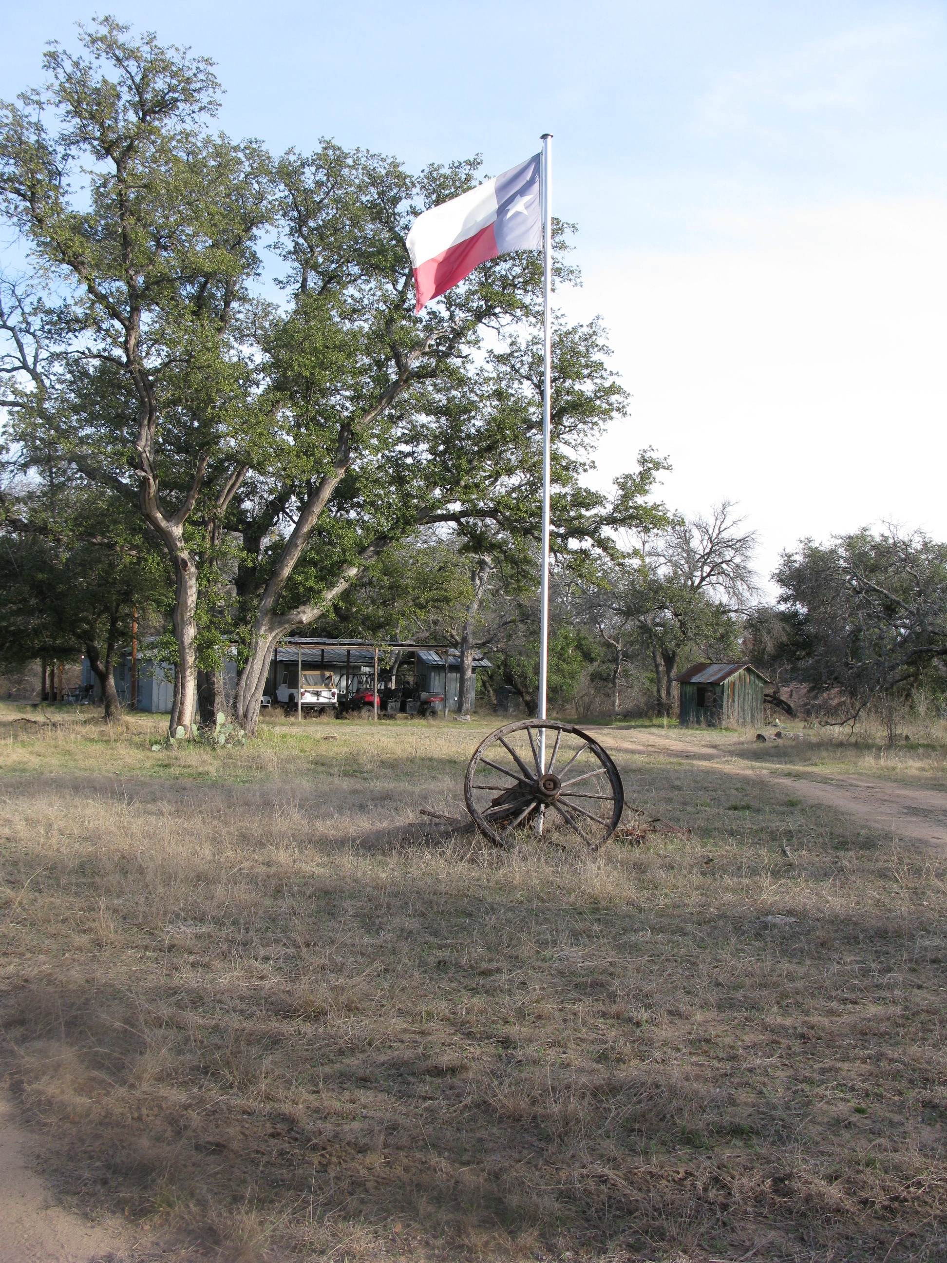 As we were returning from one of our walks, we came upon this flagpole with an old wagon wheel. I snapped several pictures, and then noticed something in the background I didn’t like, the garage.
