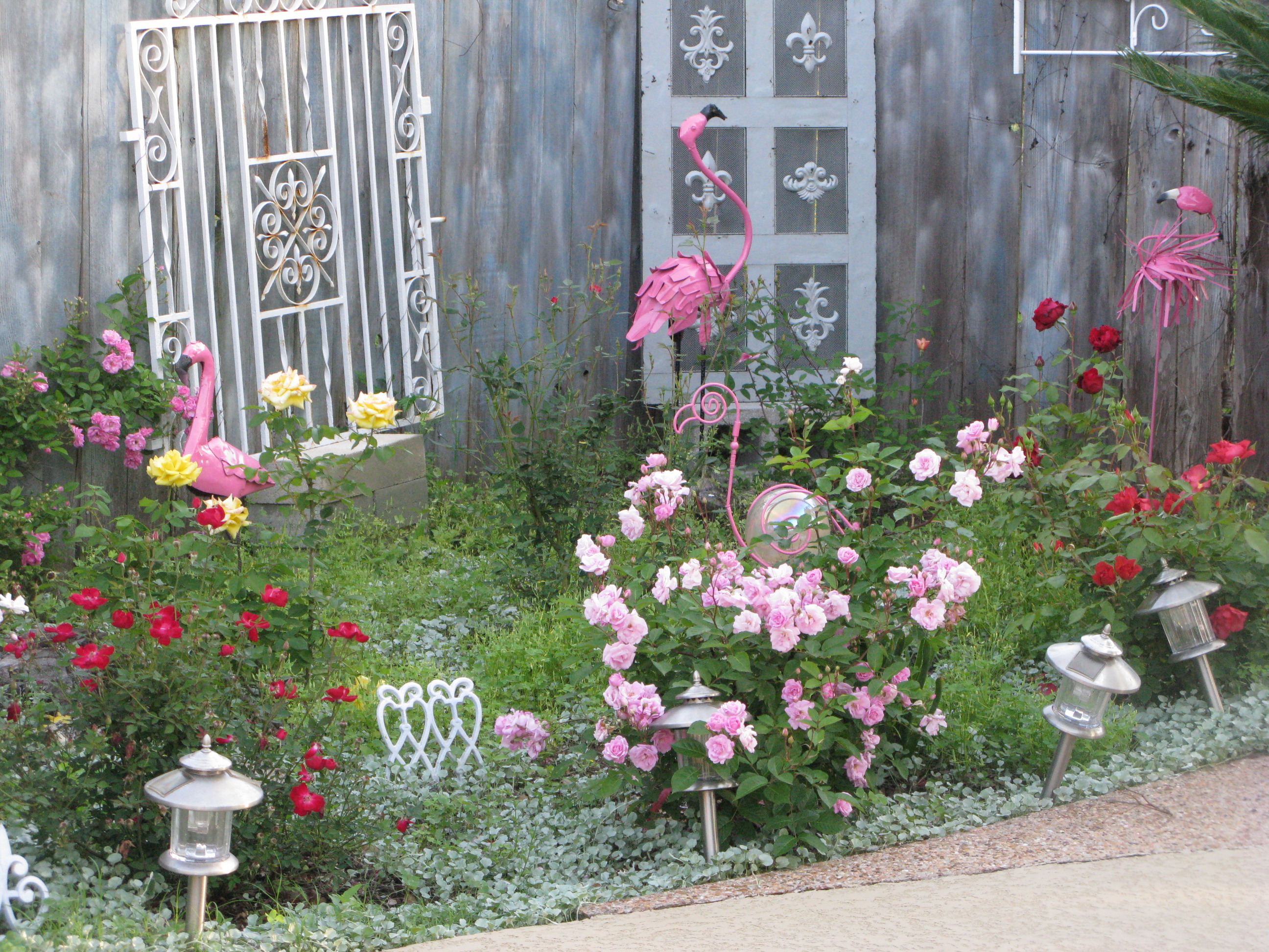 The flamingos had faded to a pale pink, and were getting lost in the sea of roses. Now they’re back.