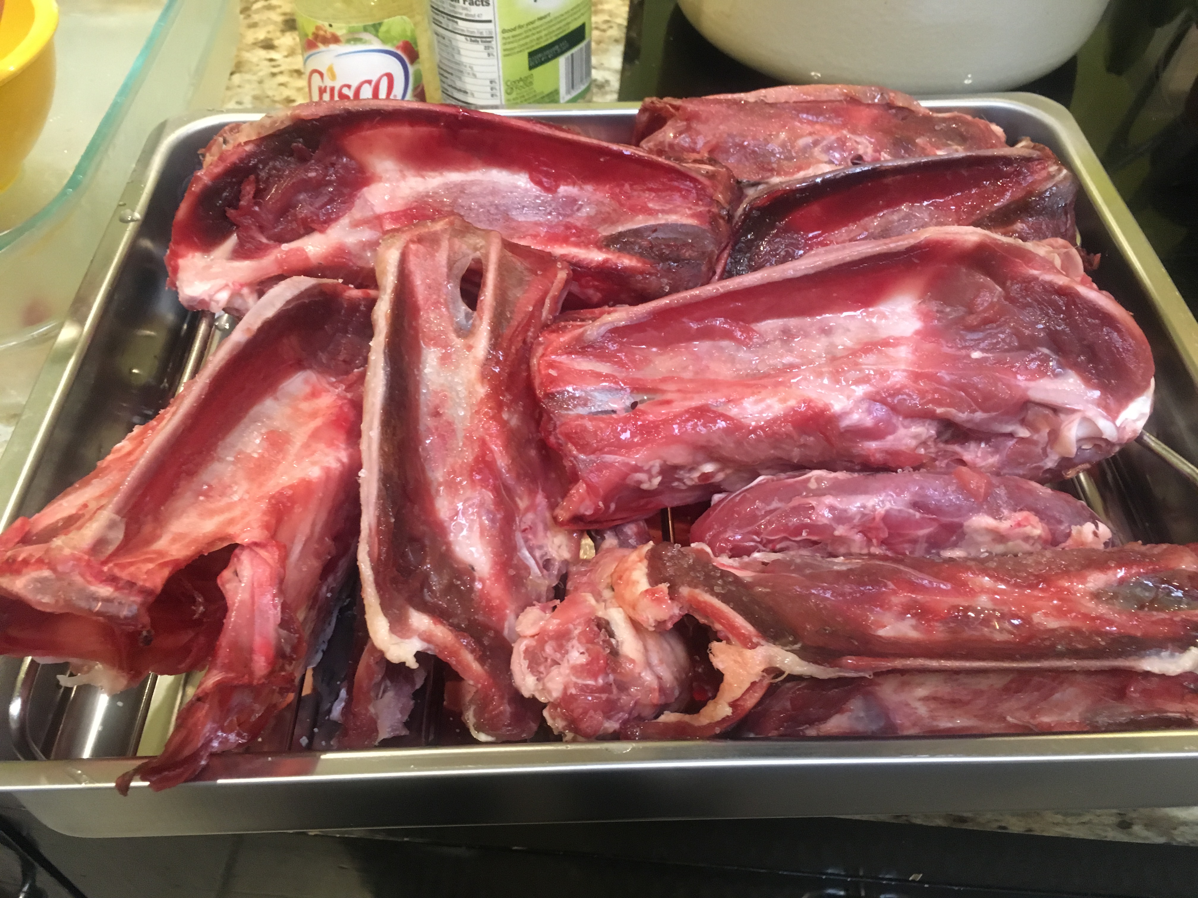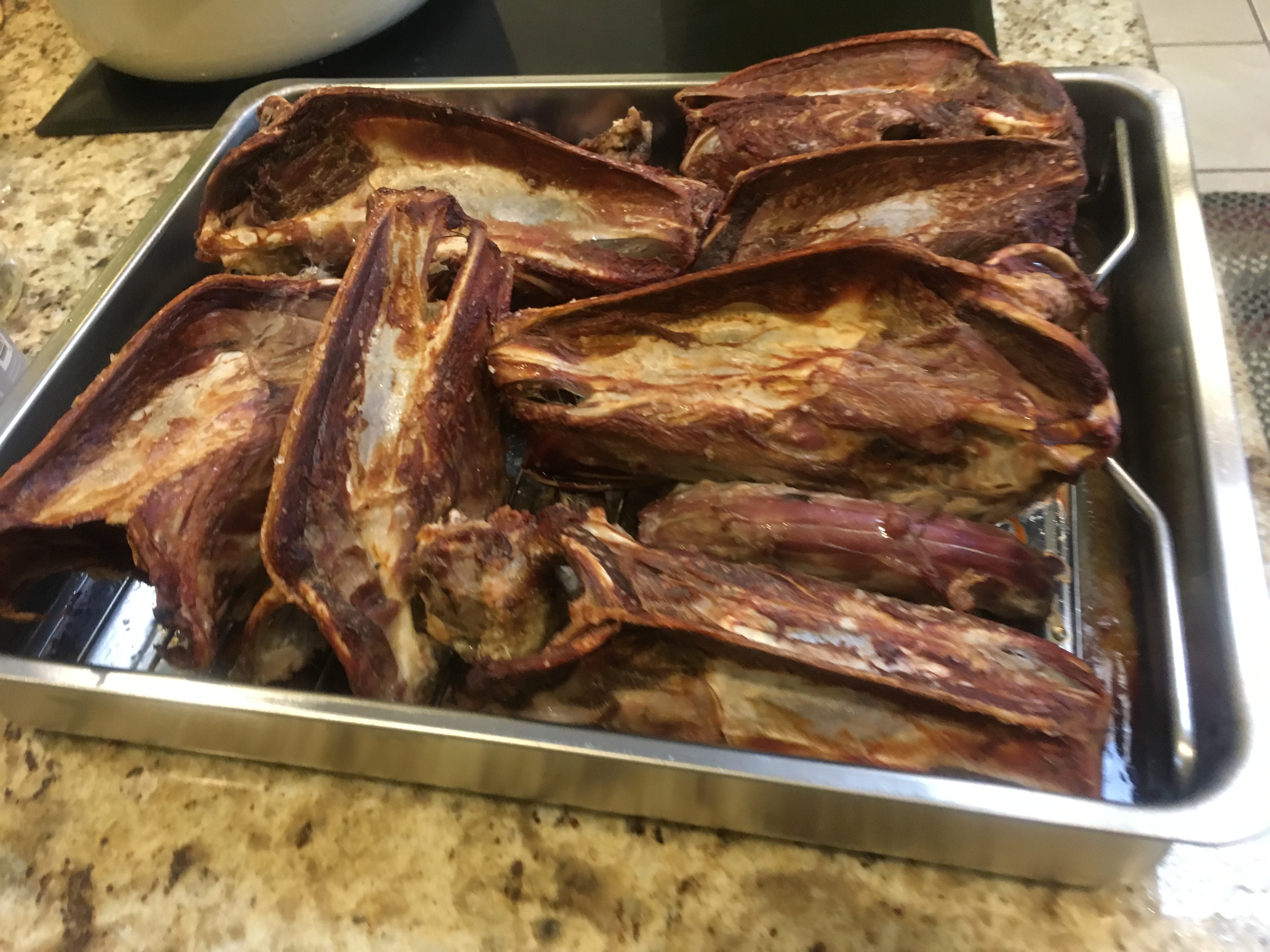 The first step was to coat the bones with canola oil and salt. I then roasted them for an hour at 400 degrees. I used 6 the bodies and necks of 6 ducks.
