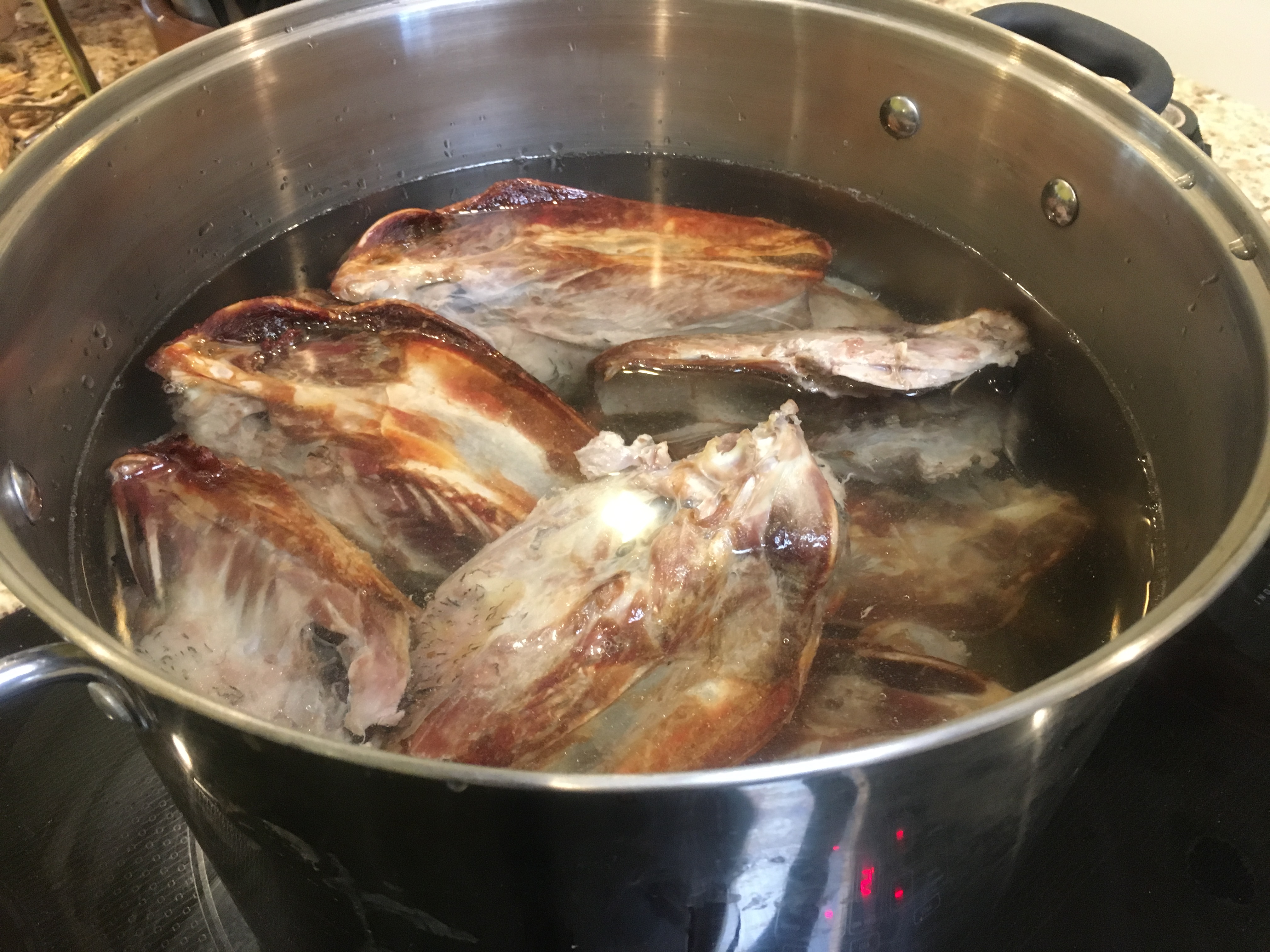 After roasting, I put the bones in a very large stock pot and covered them with water. I simmered the bones for about 3 hours.