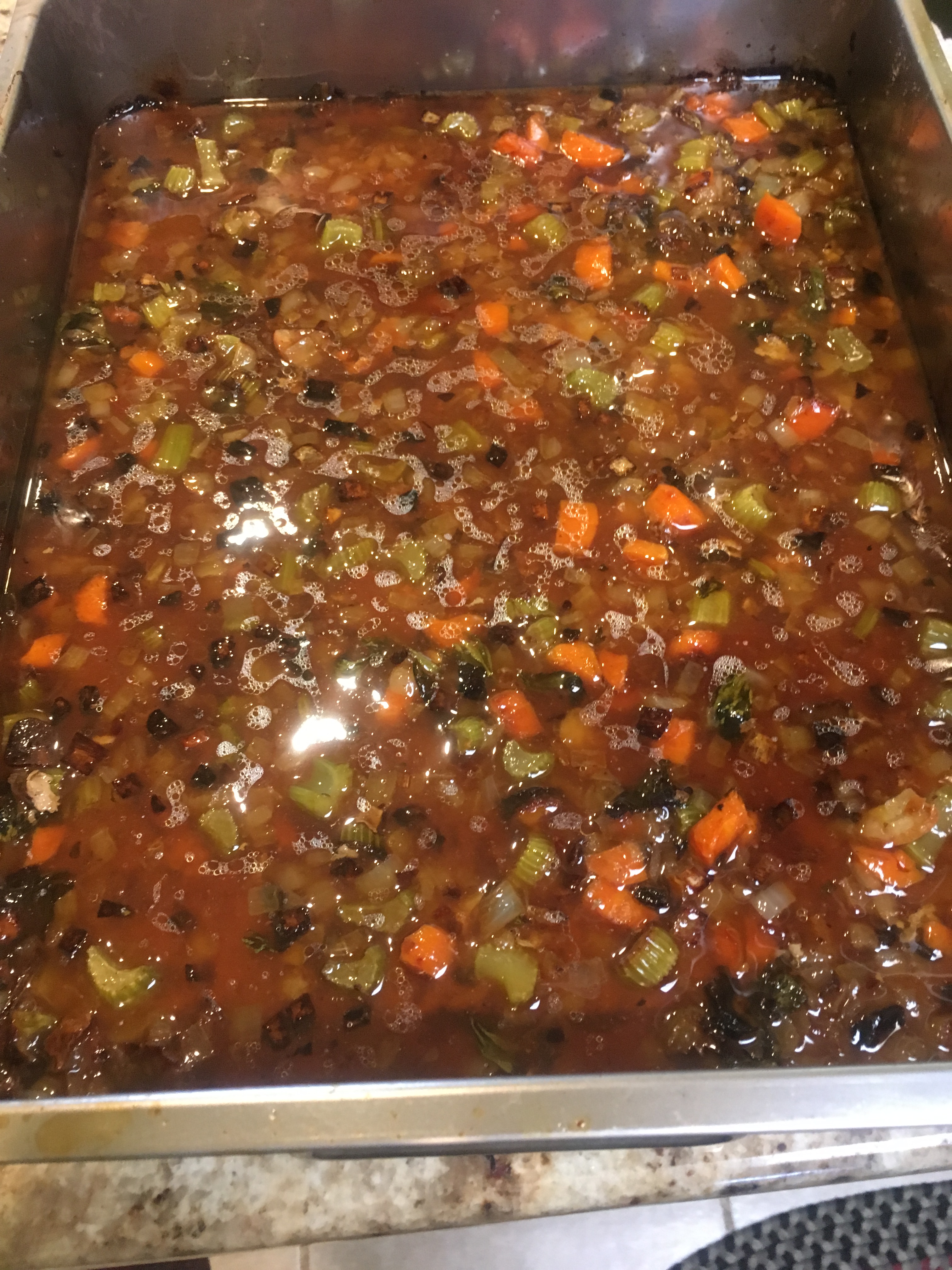 While the bones were simmering, I tossed chopped onion, celery, carrot, and garlic in the duck fat and roasted the veggies in the oven for 45 minutes. After roasting, I added a few cups of water to scrape up the bits stuck to the pan.