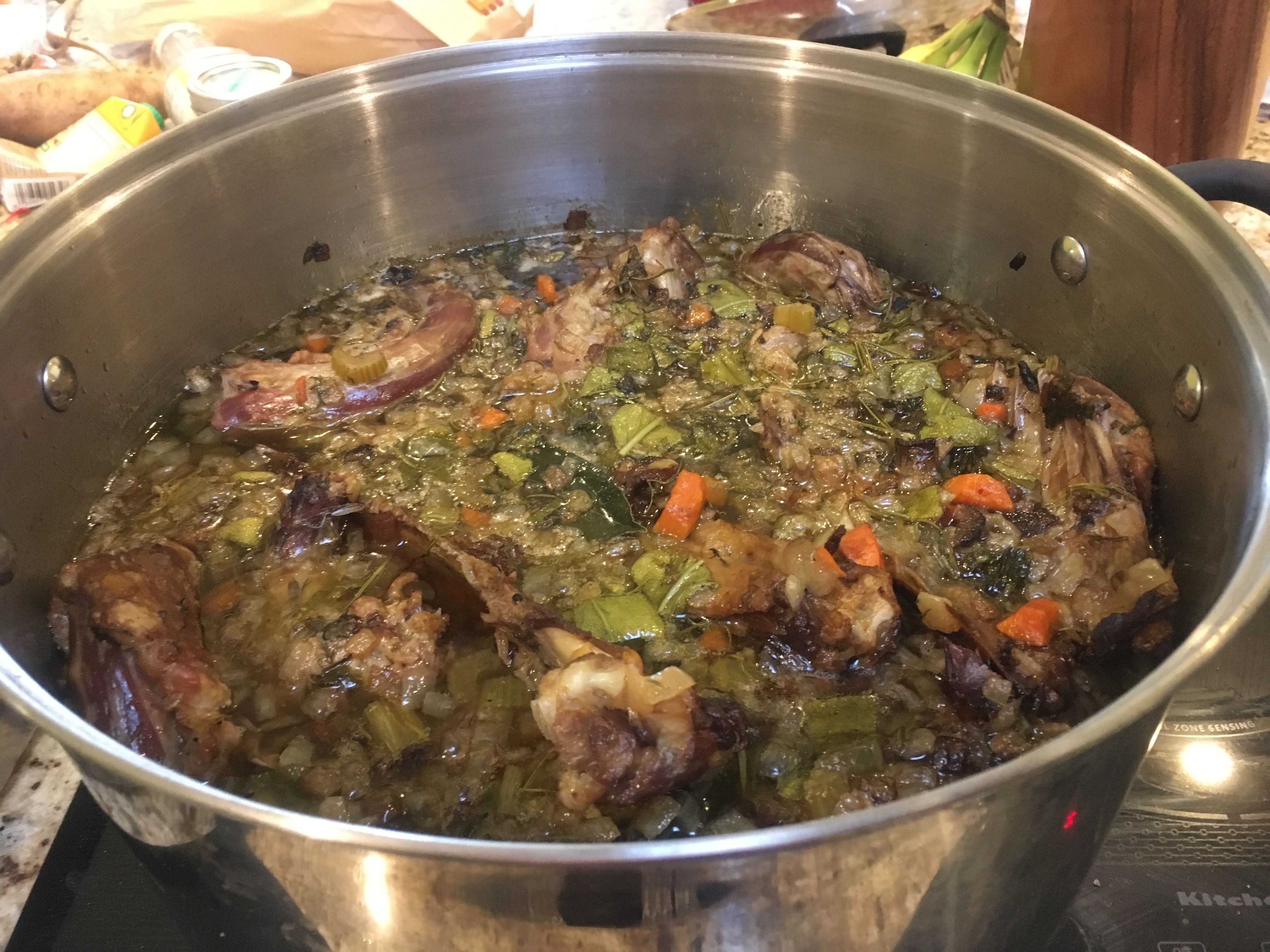 Next, I stirred everything together, along with sage, rosemary, thyme, bay leaves, and pepper. I cooked this for another 2 hours.