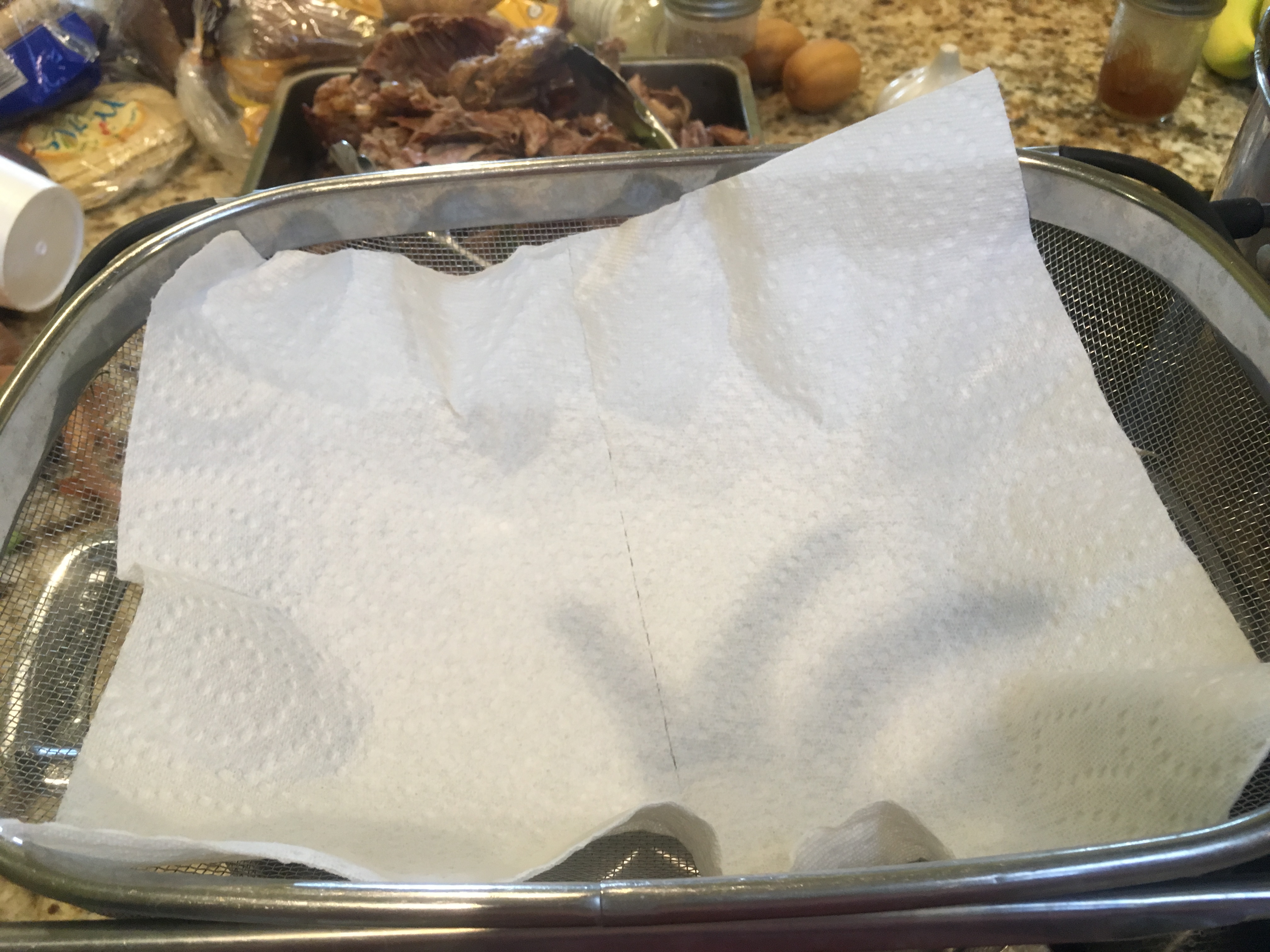Once cooked, I removed the bones and strained out the veggies and herbs. I used paper towels in a sieve, replacing the paper towels several times.