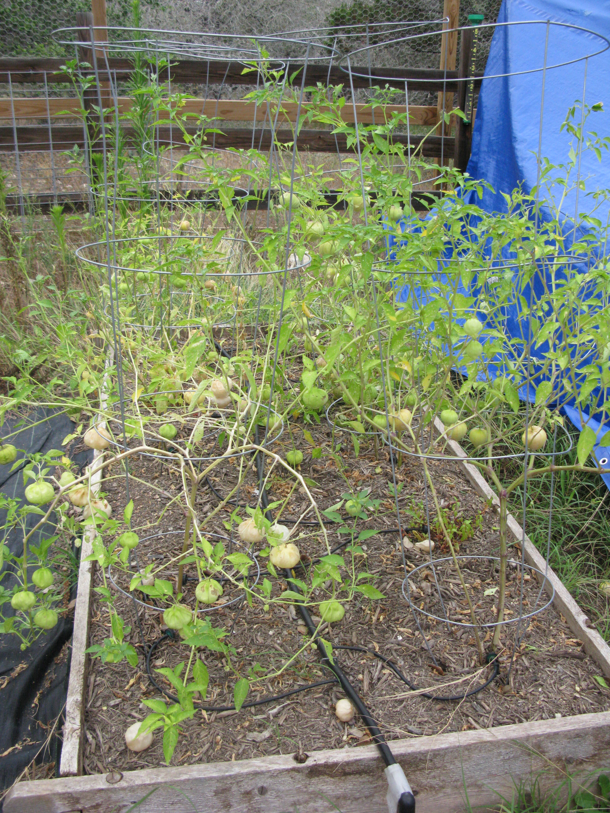 I didn’t get around to puting tomato cages in one Roma bed. I decided to give them a try since it’s supposed to be optional for them. Not a good idea. One of them snapped in half and the others have been much more susceptible to caterpillars and other critters.