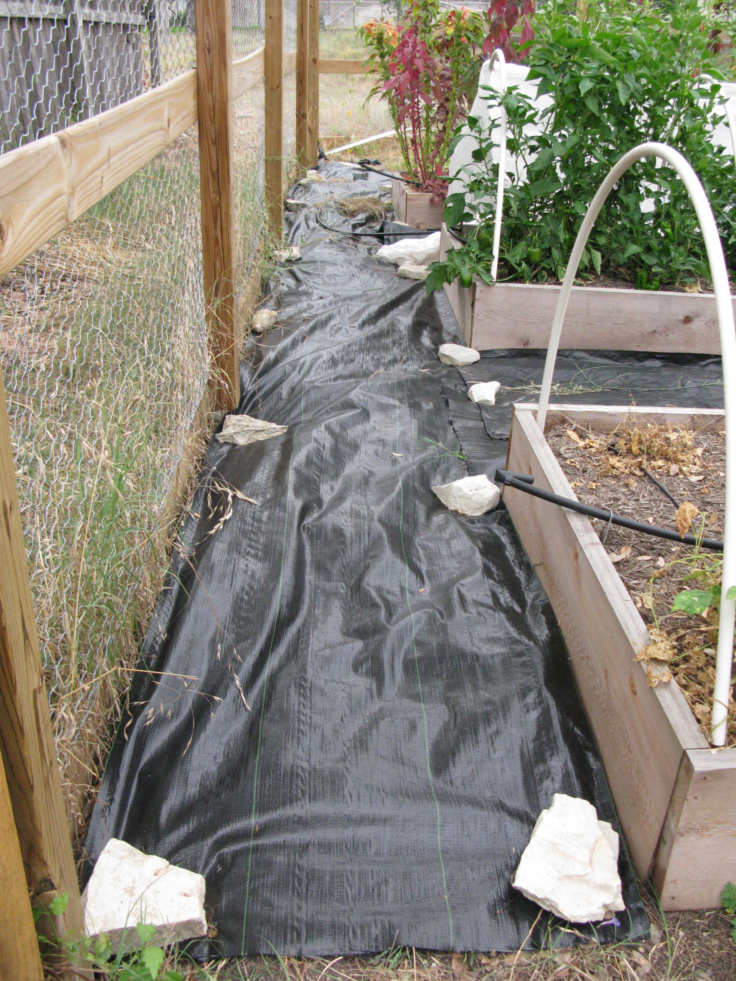 I still had two unused weed mats. I hadn’t put them down because the ground is too hard to put in staples. The bermuda has become so unruly though that I put the mats down with rocks to keep them in place. Once we get some good rain I’ll try staples again.