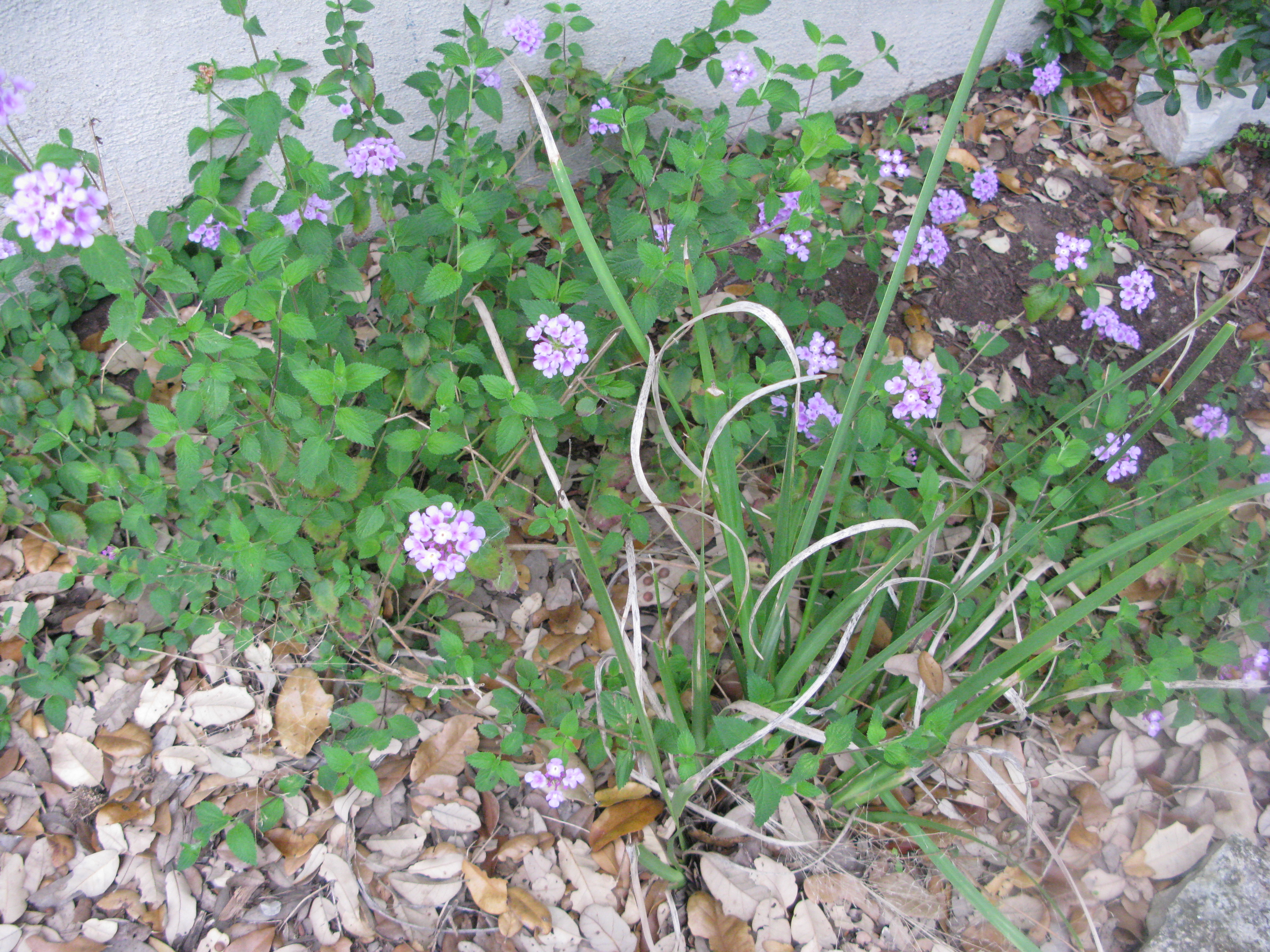 Front bed — Betony and Lantana. Nestled up against the house, this lantana bloomed all winter
